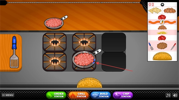 把顾客所需的肉馅下锅炒制,等进度条走到蓝色区域时,就点击左侧的蓝色铲子来翻炒。