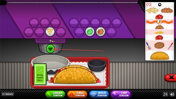把做好的塔可放入餐盘,再为顾客装取小食,之后点击绿色按钮完成取餐。