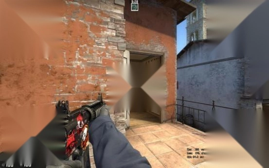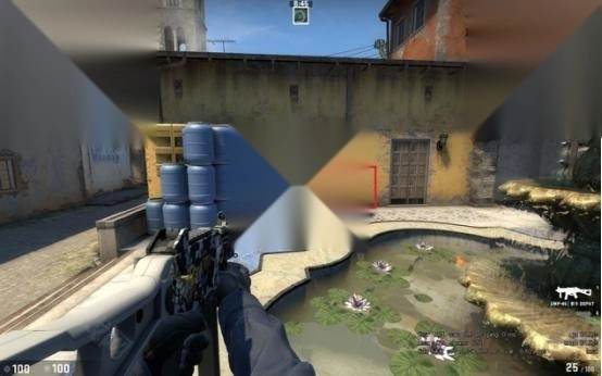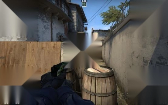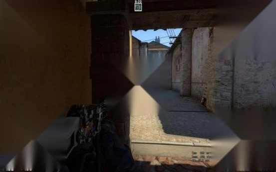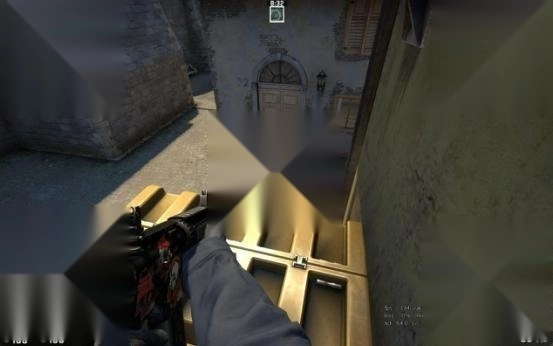 当T进攻B点断后的时候,站这里比贴墙好的原因是因为地图的改动,香蕉道门口两边都可以站人,此时如果对手稍有头脑就会先看右边(图中准星瞄准的地方)再来检查左边,此时你完全可以提前半个身位知道他的动向。