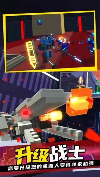 玩家能够通过战胜敌人与完成任务获取金币和经验值,这些资源可用于提升等级以及改装自己的机器人。