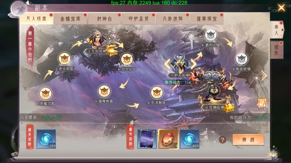 2、玩家可以自由挑战副本,不受任何条件限制进行。挑战成功后可获得通关奖励。通关每章节3、6、10层后可领取宝箱奖励。通关章节所有层次可领取章节奖励