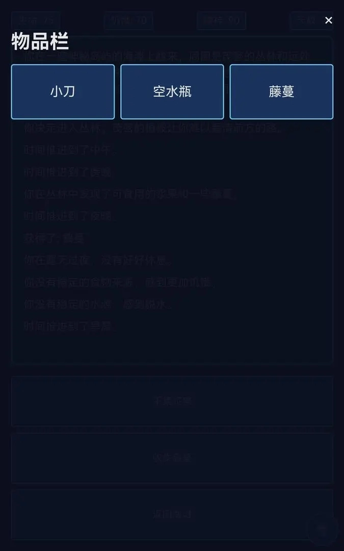 神秘岛生存这款游戏没有华丽的画面,而是以文字为玩家构建出神秘的场景,玩家借助选择系统推进游戏进程,力求为大家带来沉浸式的生存体验!在这座神秘岛屿上,你的每一个选择都将左右游戏的走向,这里有真实有趣的生存模拟环境,还有收集等多样玩法等你来探索!