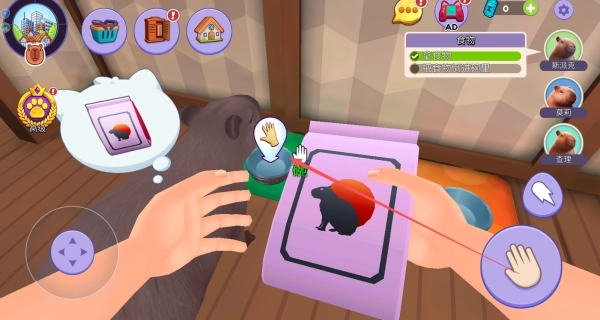 1、控制角色移动需操作左侧的虚拟摇杆,右侧的功能按钮能够实现与场景内物品或水豚的互动。