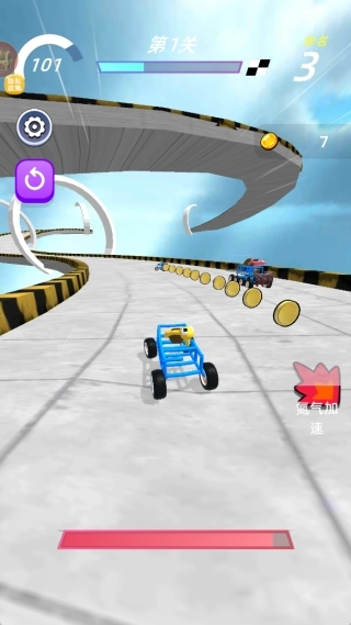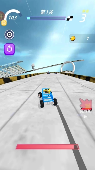 2、在赛道的关键点位布置加速带,当赛车行驶至加速带区域时,会触发短暂的高速冲刺状态,速度的提升效果十分显著。