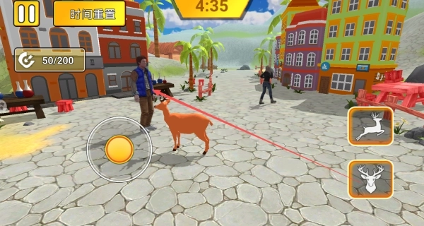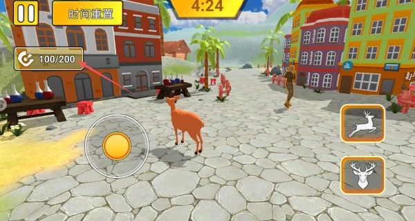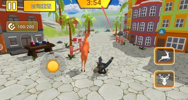 1.用虚拟摇杆来操控鹿哥的移动方向,点击冲撞按钮就能发起强力撞击,长按该按钮还能进行蓄力,以此增强破坏力,从而撞飞更重的物体。