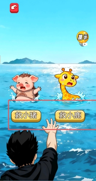 2、进入水域救援场景后,根据界面提示的“营救小猪”“解救小鹿”选项,选择目标对象触发专属救助流程。