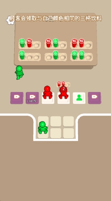 1、启动游戏后,点击顾客角色,该角色会自动领取三杯颜色相同的饮品,成功领取就能完成当前关卡的任务。