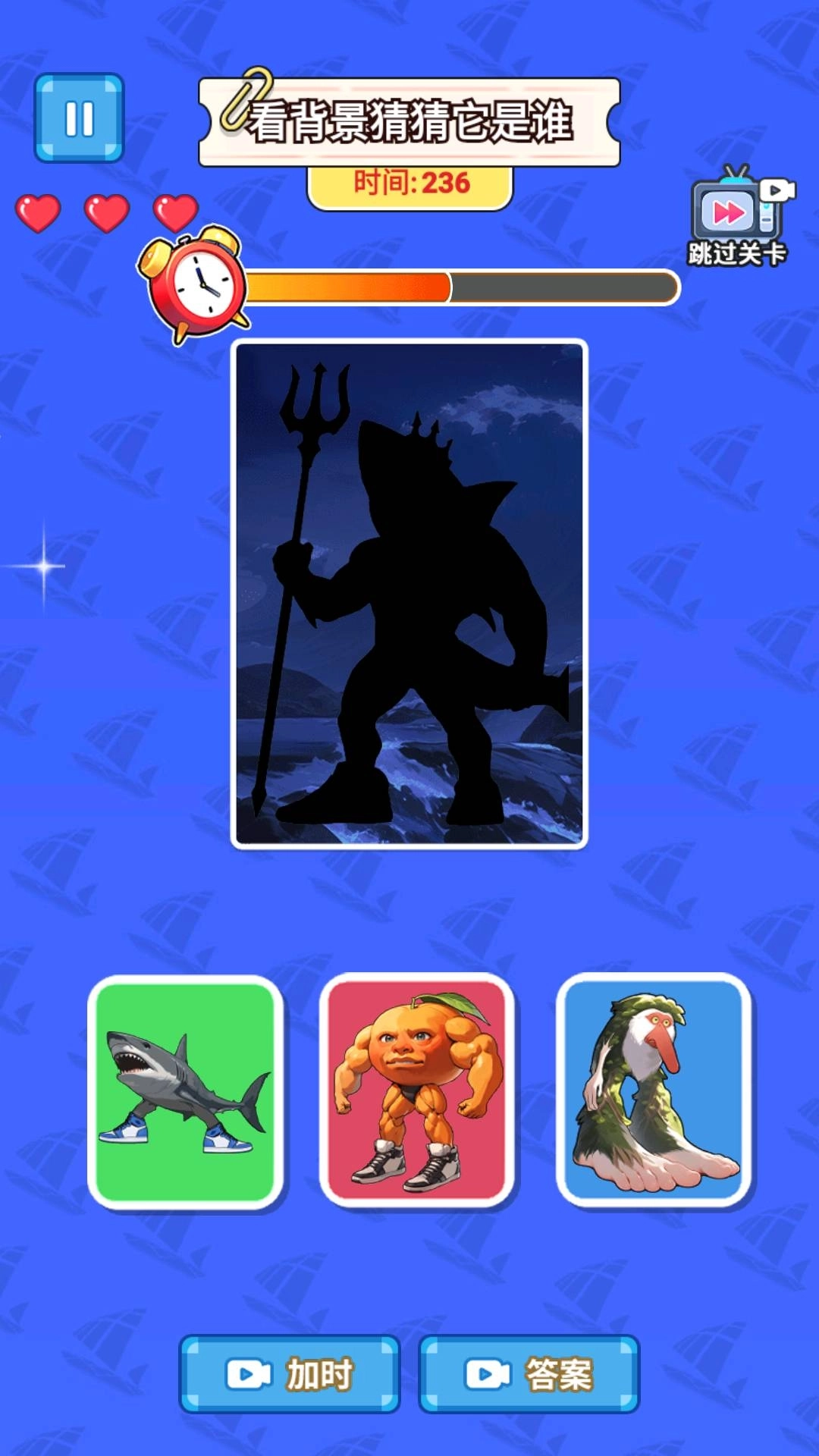 1、先记住一些常见的角色特征,像手持三叉戟的鲨鱼剪影这类,把它和鲨鱼相关的候选选项联系起来,就能快速确定答案。