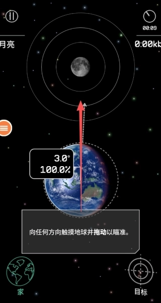 1、进入游戏后,选定目标天体,点击地球并朝任意方向滑动,以此调整探测器对准目标的飞行路径。