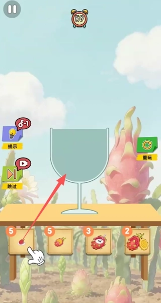 1点击屏幕下方的火龙果,拖拽至上方杯子即可完成基本操作。