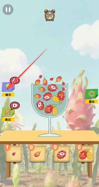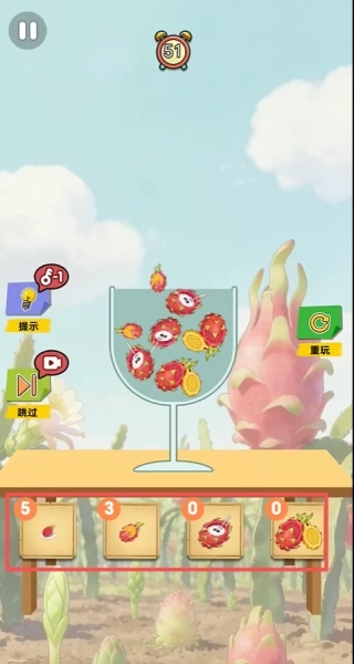 2留意屏幕下方显示的各种火龙果剩余数量,需将指定数量的火龙果全部成功放入杯中。