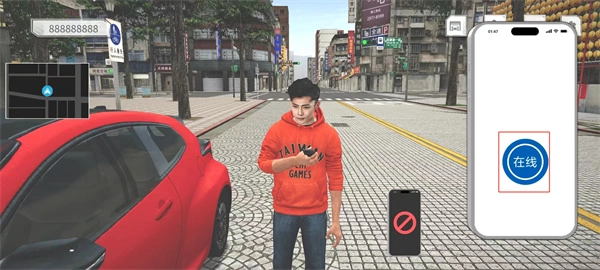 4、进入手机界面后,继续点击界面上的【在线】按钮,进入外卖接单界面,体验汽车驾驶配送的乐趣。
