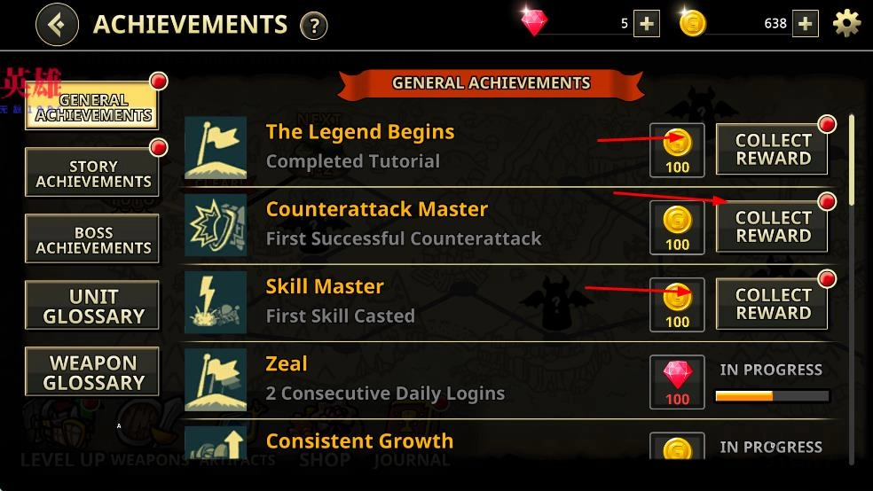 1、完成教程、首次成功反击、首次释放技能等成就任务,能够领取金币奖励,通过积累资源为角色发展提供助力。