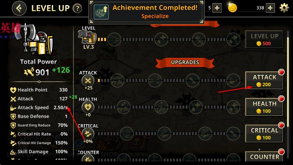 2、进入升级界面后,通过消耗金币来提升骑士的等级、攻击、生命值等各项属性,以此增强骑士的战斗能力。