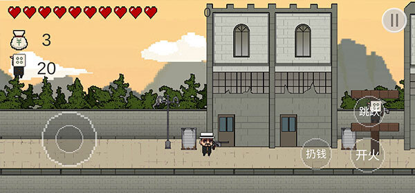 3、以单摇杆为例,小编点击进入后,发现左下角是控制轮盘,右侧依次为跳跃、开火以及扔钱按钮,而左上角则显示着当前生命值、已获得钱袋数量以及当前关卡的敌人情况。