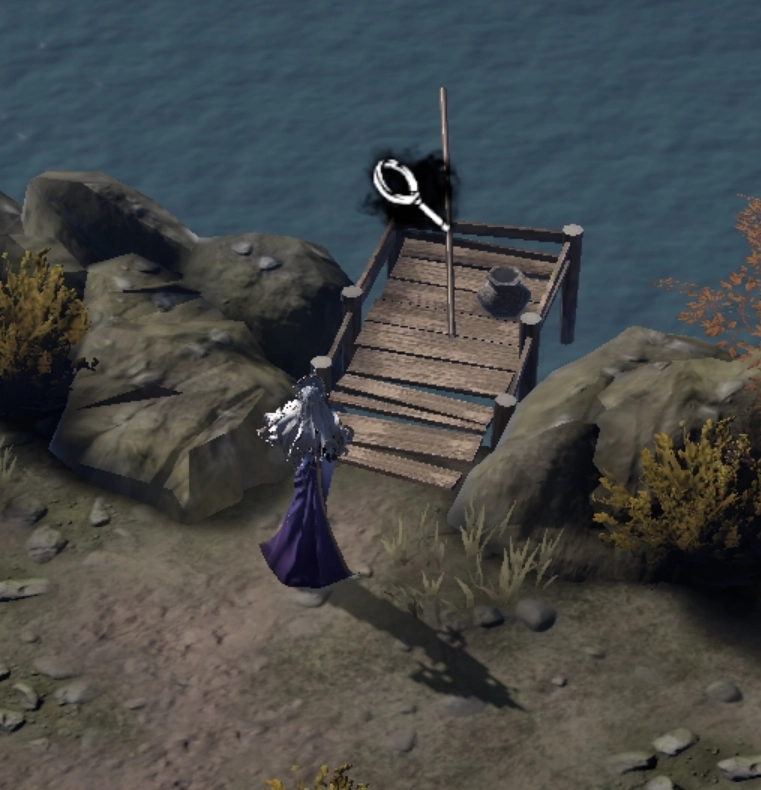 接着前往旁边这座海岛的这个地点进行网鱼,由于我忘了计数,又额外买了8个渔网,差不多网了10次。因此建议你不妨先购置10个渔网,随后就在下图所示的位置持续网鱼。