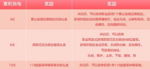 3、在这之中,当累积充电次数分别达到4次、8次、10次时,可获得额外奖励,如爱心玫瑰武器、甜甜巧克力装扮等。