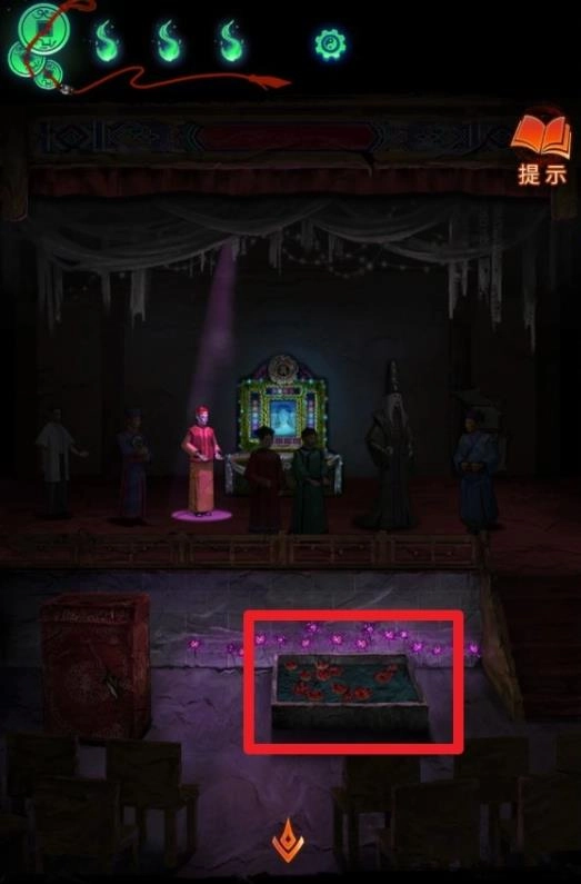 3、返回演出房间,点击花盆,依据线索点击对应的【缘、心、无、云、赞、菩】,如此便可完成解谜。