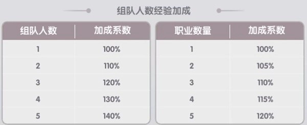 组队人数越多,组队的职业种类越多,都可以获得额外的经验加成。