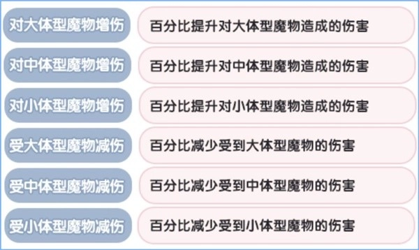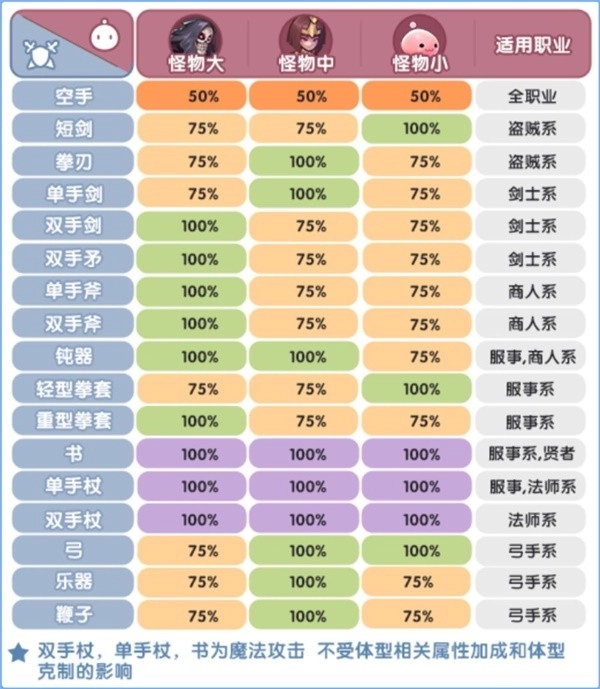 除双手杖、单手杖以及书这几类魔法攻击武器不受体型相关加成与克制影响外,其他职业在使用不同武器时,针对不同体型的怪物,所能造成的伤害存在差异。