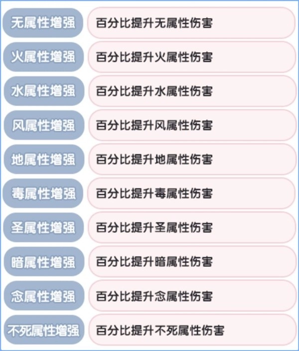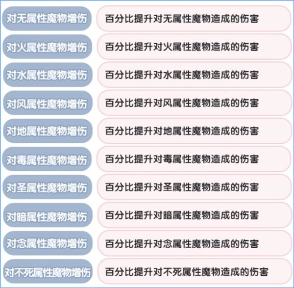元素属性克制主要包含两种类型,一是针对某个属性的伤害加成,二是针对某个属性的抗性提升。此外,还能够对特定属性进行专门强化,从而提高该属性所造成的伤害。