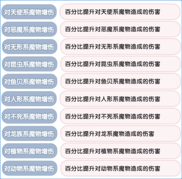 种族克制是许多职业独有的特性,像猎人系职业中的弓箭手,在进阶为猎人后,能够获取“动物杀手”这一被动技能,该技能效果为对动物系、昆虫系以及鱼贝类魔物造成的伤害得到提升。