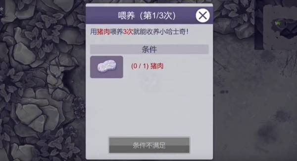 答:在与鼠哥对话时,选择哈士奇地图,成功击败流浪狗,接着用猪肉投喂哈士奇三次,如此便能够收养它。