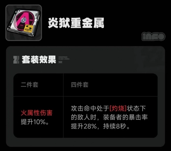 四件套效果:当攻击命中处于[灼烧]状态的敌人时,装备该四件套的角色暴击率提高28%,此效果持续8秒。