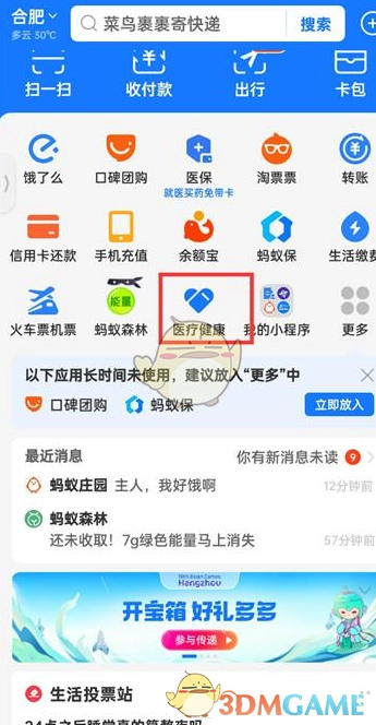 1. 首先打开支付宝,进入其首页,接着点击“医疗健康”。