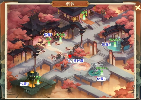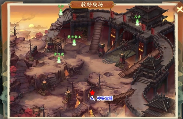 2. 在朝歌的中间台阶处,有这样的布局:跃跃位于纣王后方,中间有雕像,左下角是罗宣,右上角为啸风妖王。