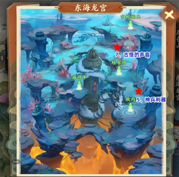 7、在东海龙宫,于右上角的龙宫侍女处,接着在下面中间的桥上触发剧情,桥上有小跳蛙。