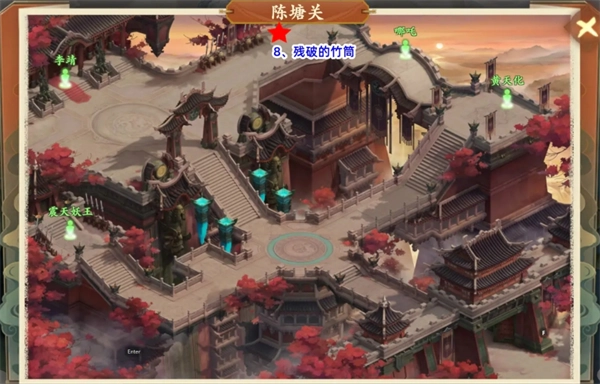 8、在陈塘关,先获取右上角兵器架旁地下的竹简,接着从右下角出城门触发剧情,然后找到地下的盒子,之后与李靖互动,最后再次出城门。