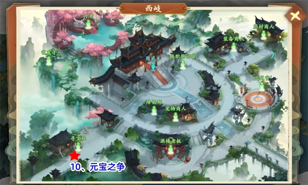 10、在西岐,先找到右下角寻宝妖旁边的守卫。接着,前往右下角水车旁边的地下拿碗。之后,到船旁边的台阶上打水。最后,返回去找守卫。