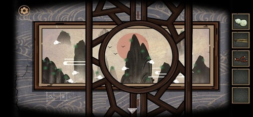 4. 走到描绘日出的画作跟前,将镂空屏风间与红色中线对齐。依照左下角的提示,依次数出圆圈内☁️有2个、?有3个、?有8个、⭕有1个。也就是说,左边书柜下方柜子的密码是:2381 ,获取④榔头。