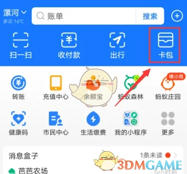 1. 第一步,打开支付宝app,在首页页面,点击页面中的【卡包】。
