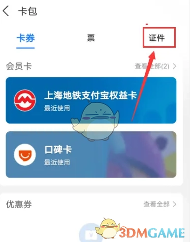 2. 进入新页面之后,点击右上角的【证件】。