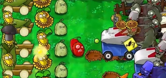 4、铲除上方所有的阳光向日葵,补上一排毁灭加农炮。