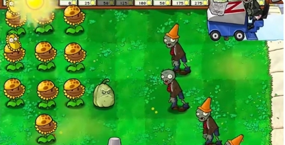 2、首先在左侧上三路栽种多个阳光向日葵,于三路和五路种植两个窝瓜坚果。