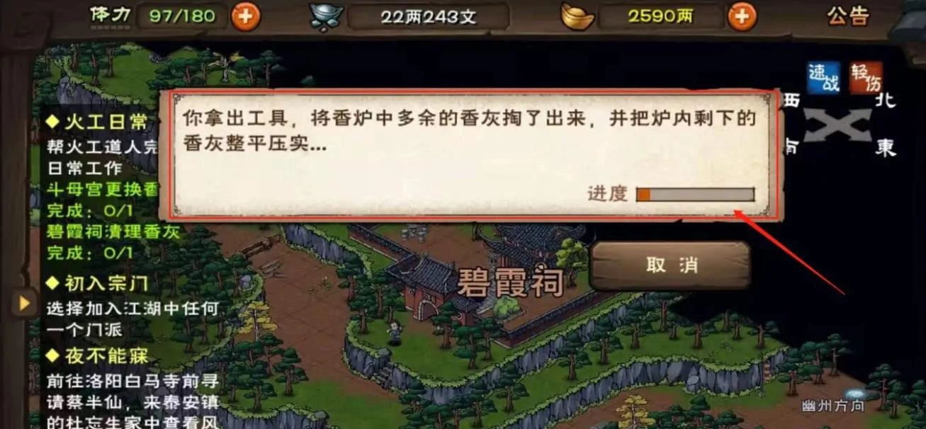 在烟雨江湖中,该如何清理碧霞祠的香灰呢?在烟雨江湖这款游戏里,可供玩家探索的区域相当丰富,玩家能够在游戏地图上自由展开探索。在探索过程中,不仅能收集到各类有实用价值的物资,还会触发一些奖励颇为丰厚的任务。就像当玩家来到碧霞祠的指定地点时,就能触发清理香灰的任务。以下是小编整理的相关方法,大家不妨了解一下。