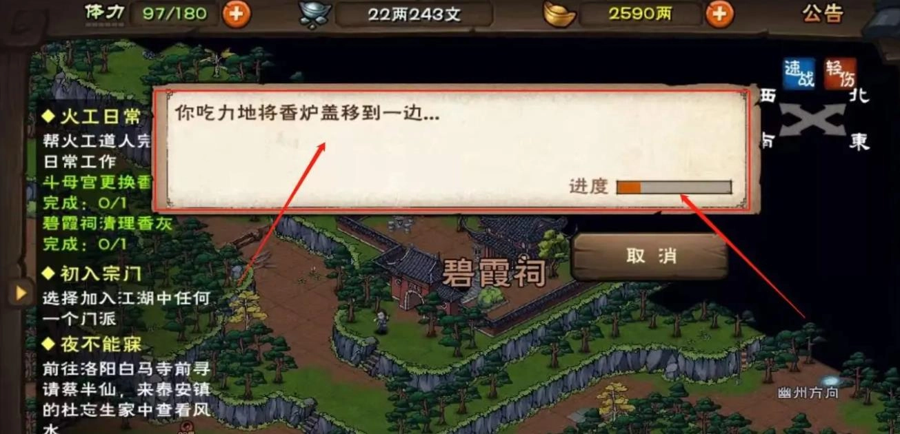 答:在碧霞祠清理香灰,直至进度条达到满格状态就可以了。
