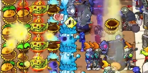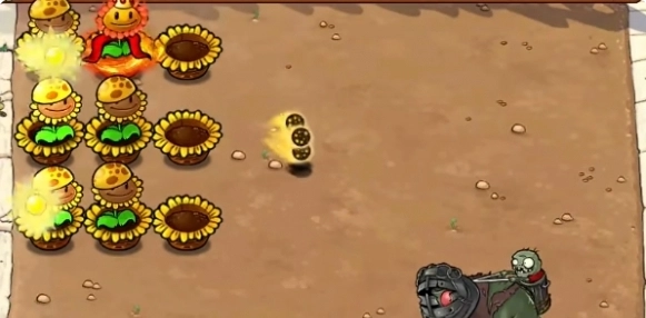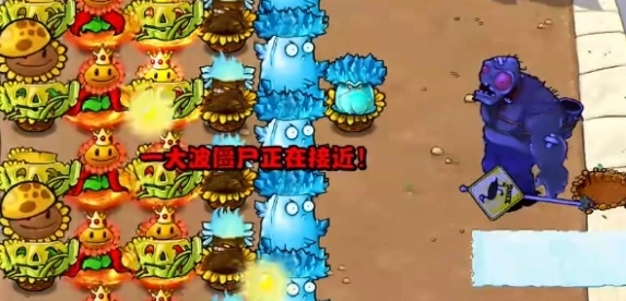 3、接着把左侧三列的阳光向日葵补充完整,在第四列种下一列冰炬木桩。