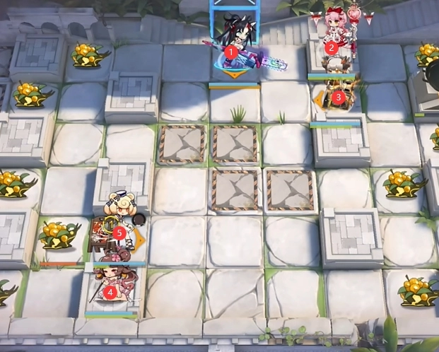 在如图所示的位置,依次部署煌(攻击方向向下)、澄闪(攻击方向向下)以及塞雷娅。