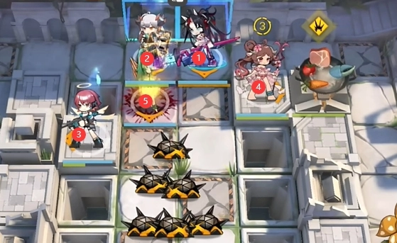 在如图所示的位置,将煌(攻击方向向下)与塞雷娅进行部署,以此来提供阻挡效果。