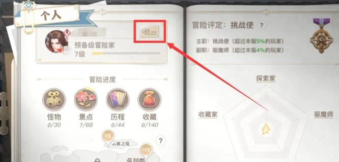 3、来到个人冒险手册页面,点击角色后方的【名片】图标,具体位置如图所示。