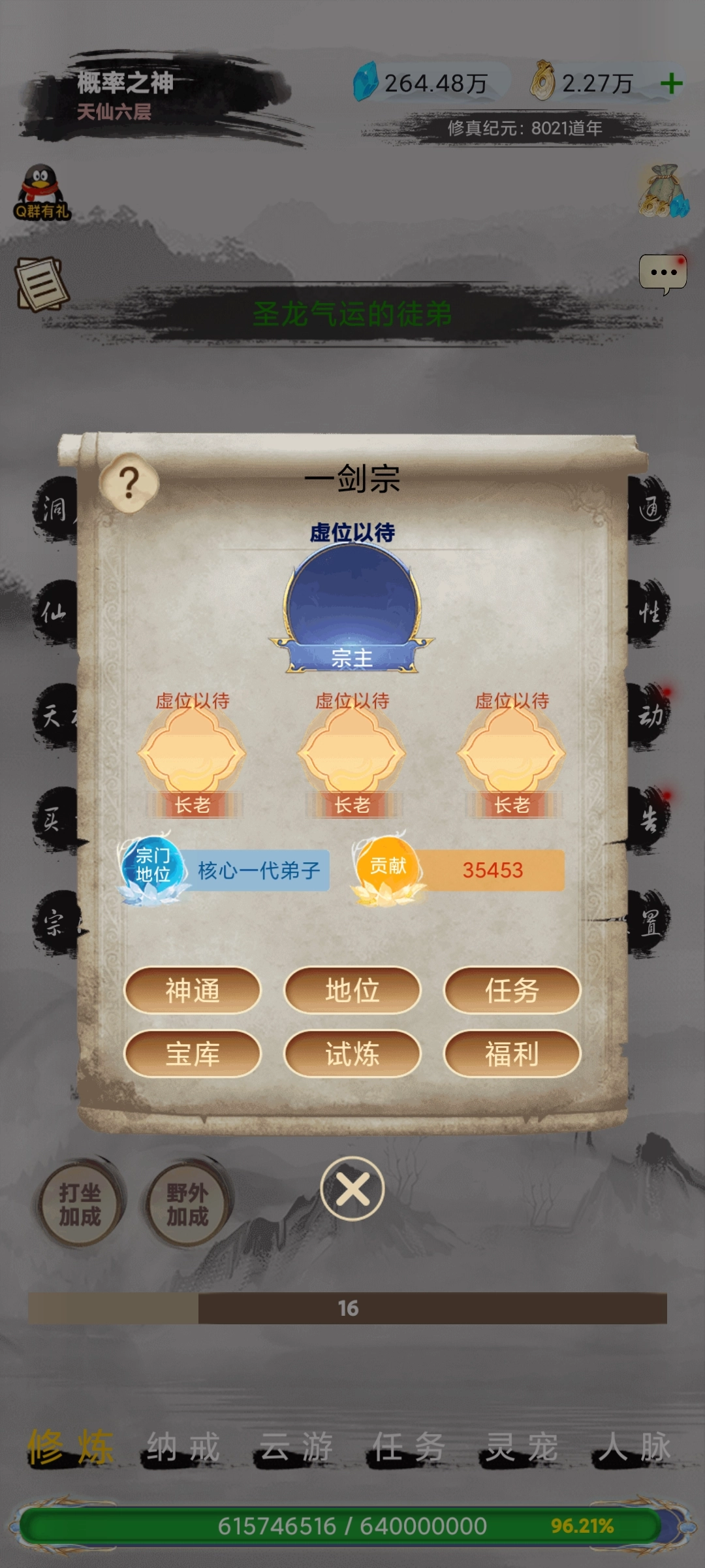 宗门试炼获得贡献,升级地位,解锁神通技能。