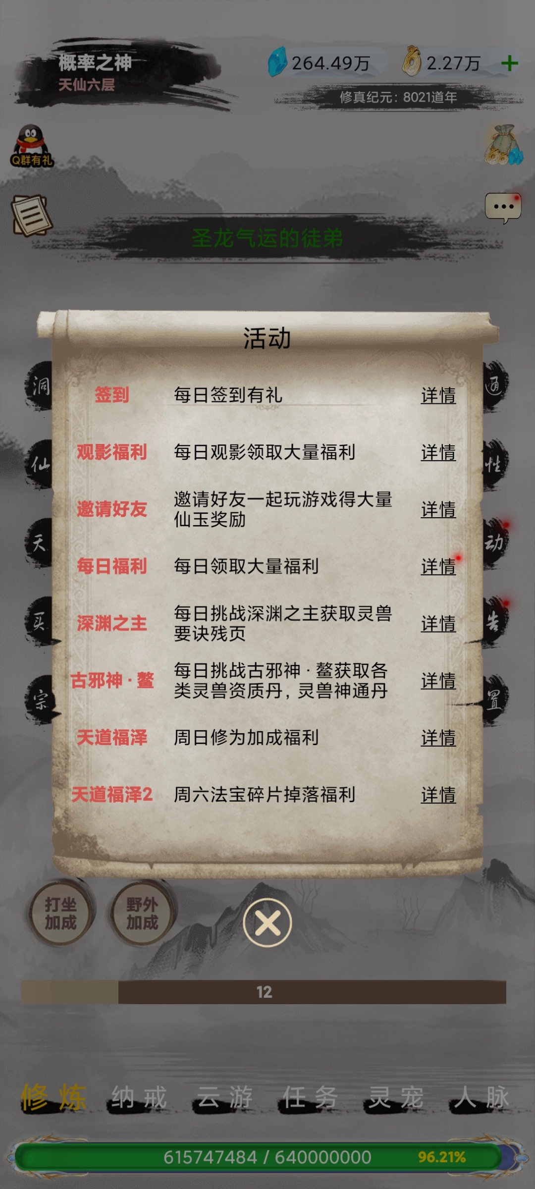 1. 奇遇:每日可进行10次。奇遇中有半价丹药,还有神品渡劫丹(仙君境界之后会紧缺)。在奇遇的乞丐任务中,不太建议购买,花500仙玉有可能只得到一句谢谢(或者一颗上品灵石、金色残页、稀有蛋、仙兽蛋)。当然,要是你喜欢冒险碰运气,那肯定会买,毕竟万一得到仙兽蛋,万一开出仙兽了呢。而且奇遇是在境界达到登仙之前,唯一能获取仙兽蛋的途径 。