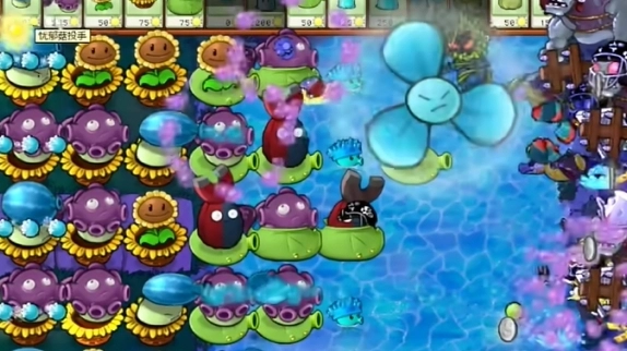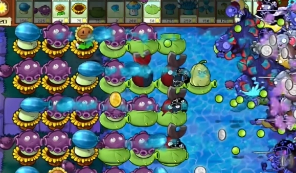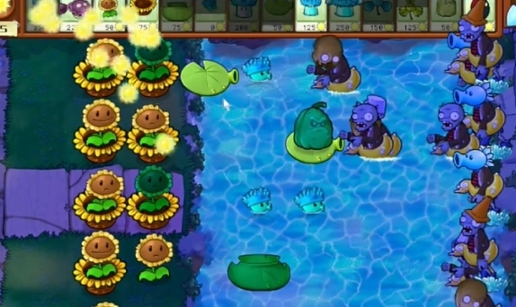 2、首先在左侧种下多个向日葵花盆以及损坏的向日葵,于右侧水池里种植寒冰海兵菇。