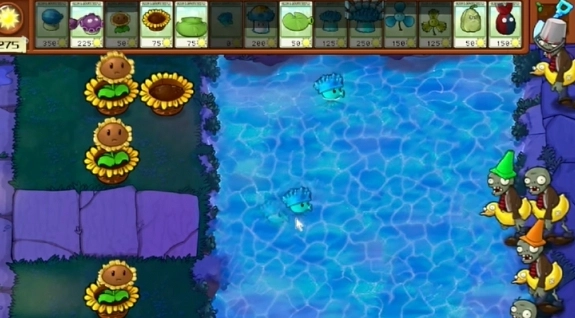 3、接着在左侧再补充一列损坏的向日葵,并在水池里种植荷叶。