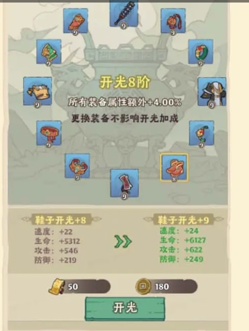 通过消耗开光符与升阶符对装备进行精炼,以此提升所有装备的基础属性。当装备精炼阶级满足指定条件时,便能激活合鸣效果,从而实现道行的提升。