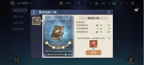 2、玩家能够通过购买来提升玄天绝技的等级,不过鉴于平民玩家在前期资源相对有限,建议谨慎进行购买。